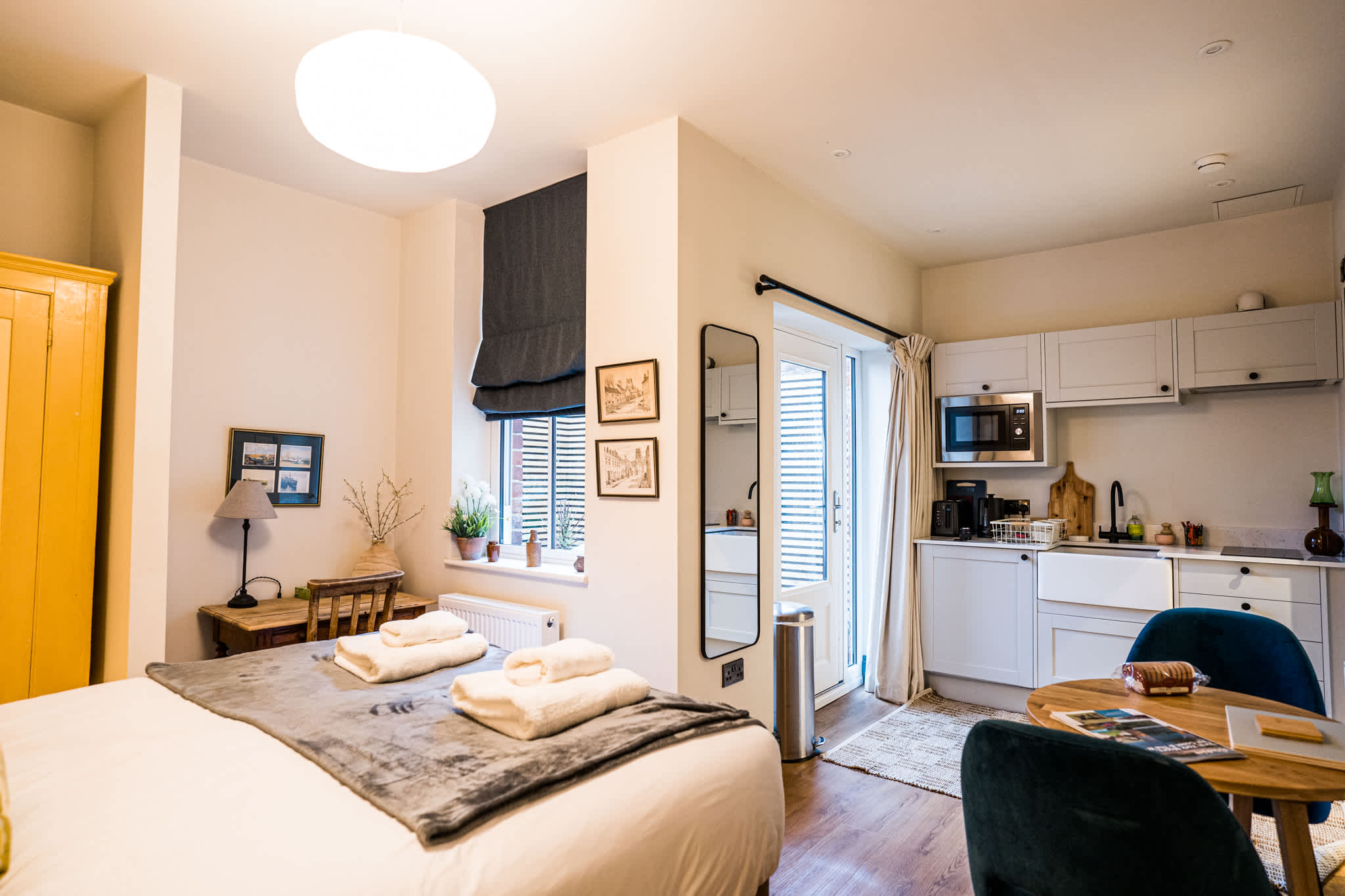 Willows studio 4 is a bright and versatile ground-floor studio, thoughtfully designed for guests looking for a little more flexibility. One of only two rooms at The Willows with a kitchenette, Studio 4 is ideal for longer stays, short breaks, or travelling with pets — and offers direct access to your own private enclosed courtyard.