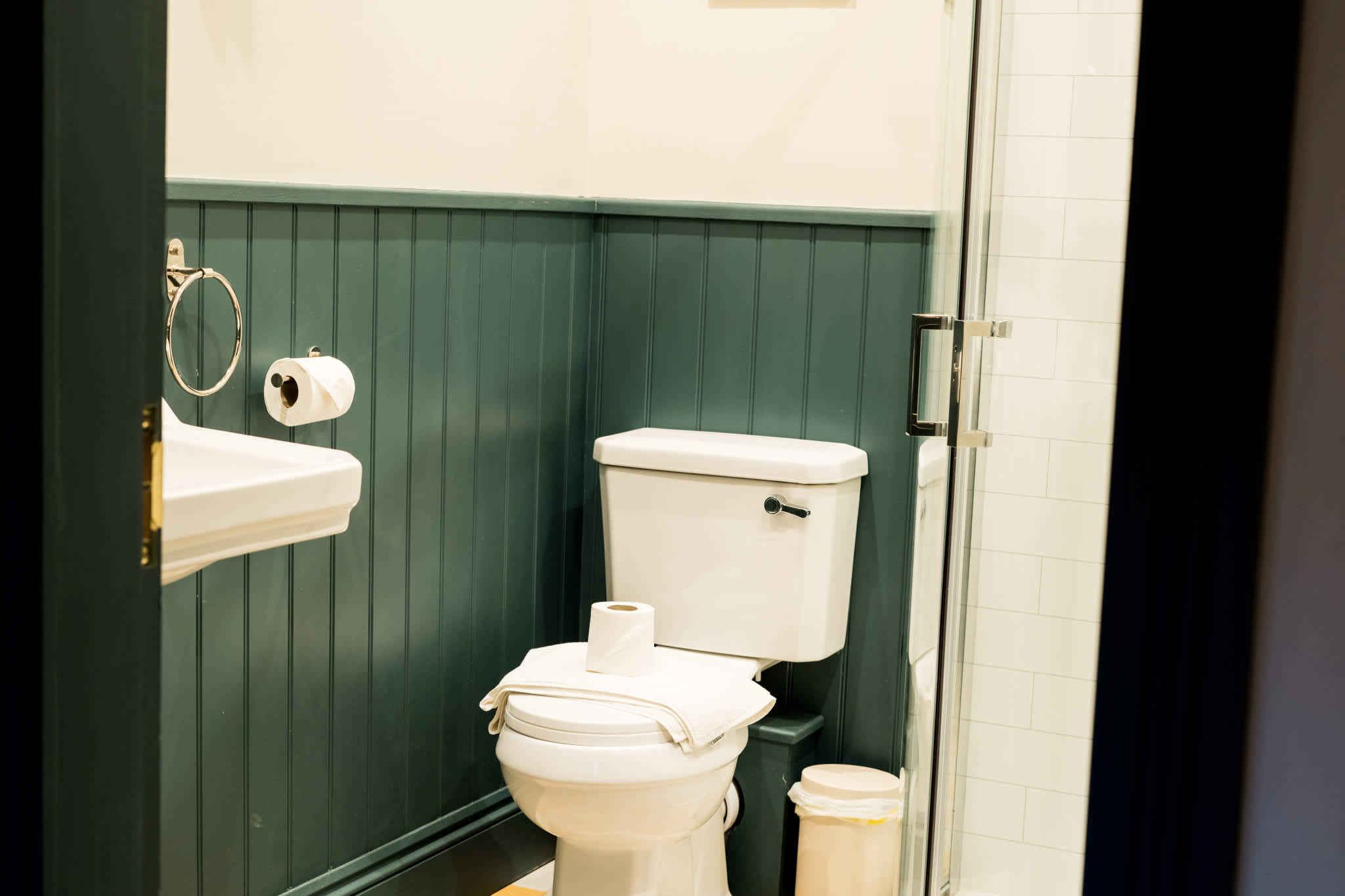 ▪️ A private ensuite bathroom with a walk-in shower, fresh towels, and modern fixtures